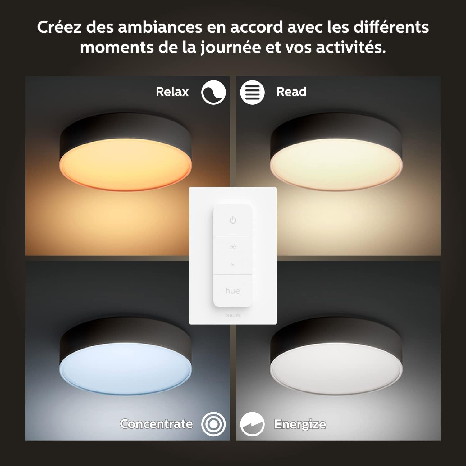 Dotée de la technologie Philips Hue, cette lampe de plafond vous permet de gérer l’éclairage via l’application mobile dédiée, compatible Android et iOS. Vous pouvez ajuster l’intensité lumineuse, programmer des scénarios en fonction de vos besoins, ou encore contrôler l’éclairage à distance grâce à la connexion Wi-Fi intégrée. Cette interaction intelligente fait de chaque utilisation une expérience personnalisée et intuitive.