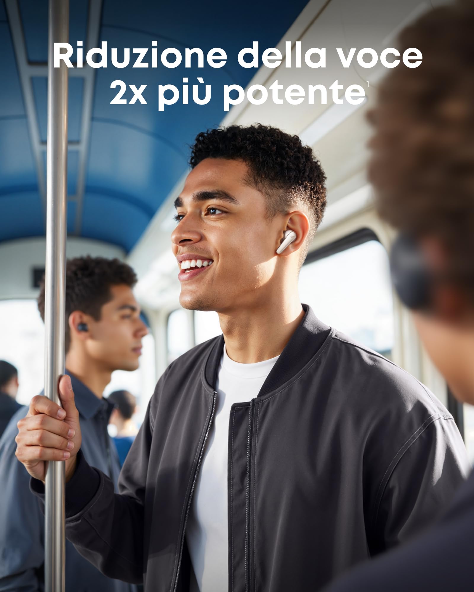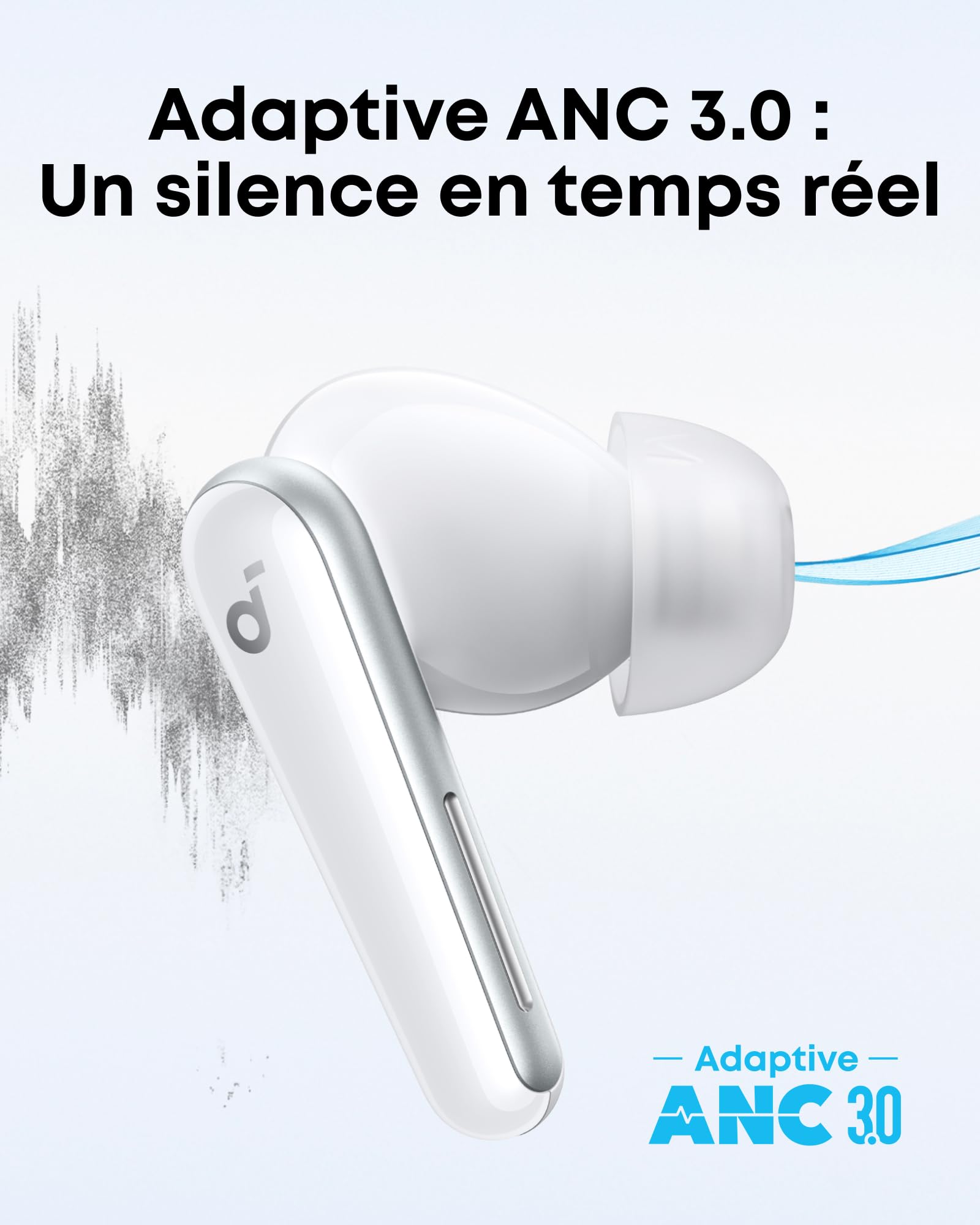 Les Soundcore Liberty 5 intègrent un système avancé de réduction de bruit active (ANC) qui analyse l’environnement sonore en temps réel pour neutraliser efficacement les bruits ambiants. Cette fonction, combinée à un mode transparence intelligent, vous permet à la fois de vous isoler dans un environnement bruyant et de rester attentif à ce qui vous entoure, comme les annonces dans les transports ou les conversations importantes.