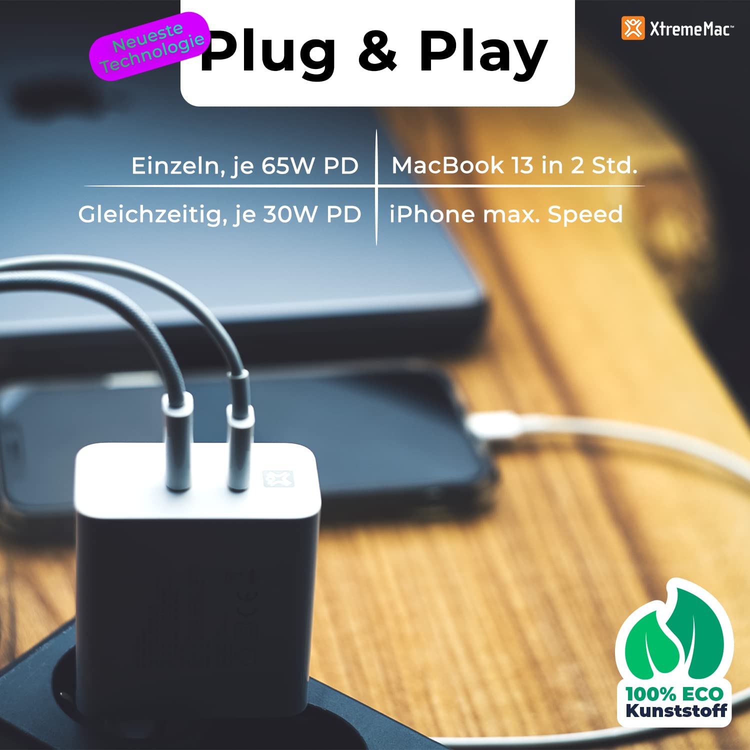 - ⚡ Nom du produit : XTREMEMAC Chargeur double alimentation USB-C 65W