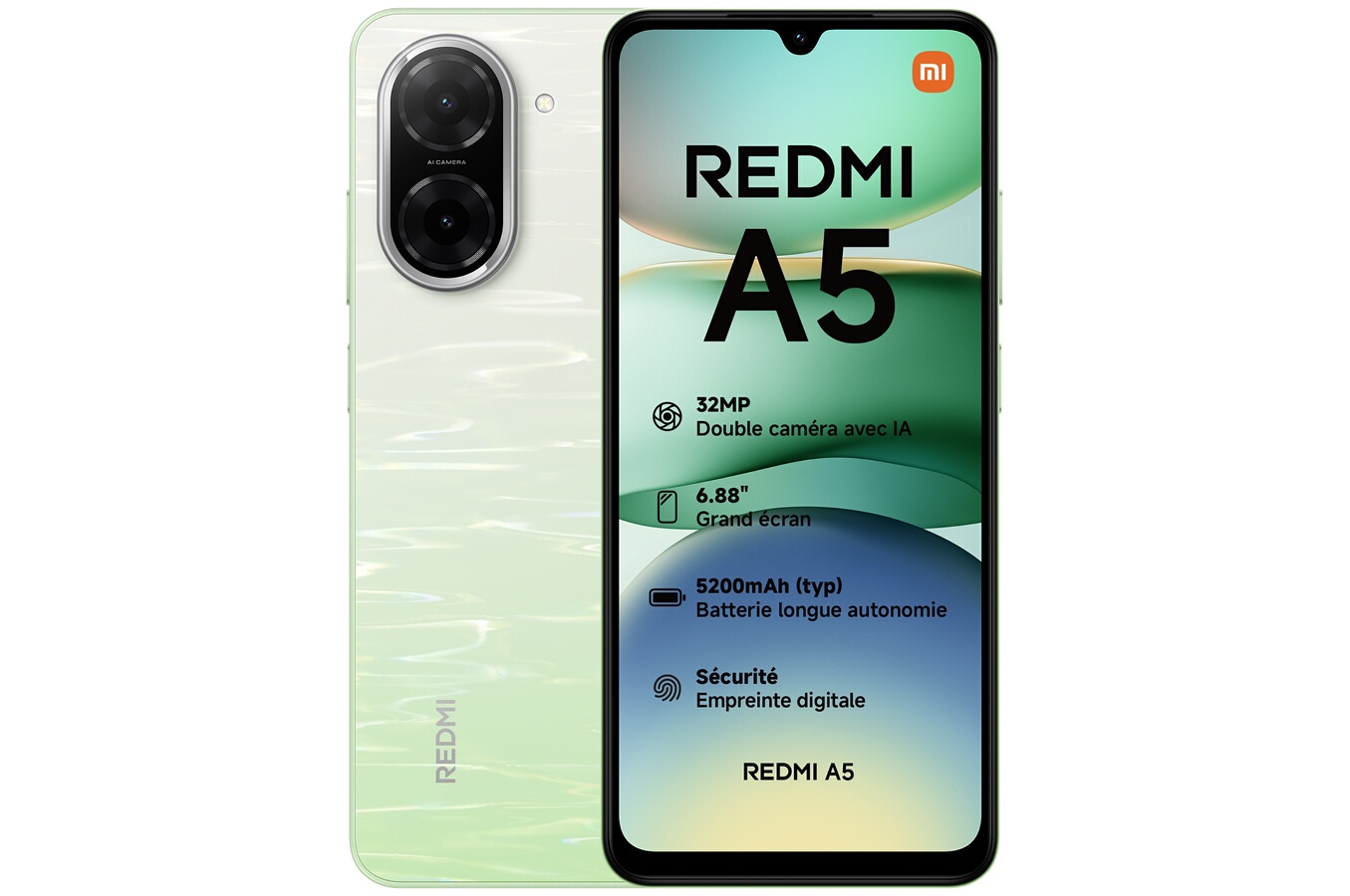 - Smartphone : Xiaomi Redmi A5 Vert (4 Go / 128 Go)