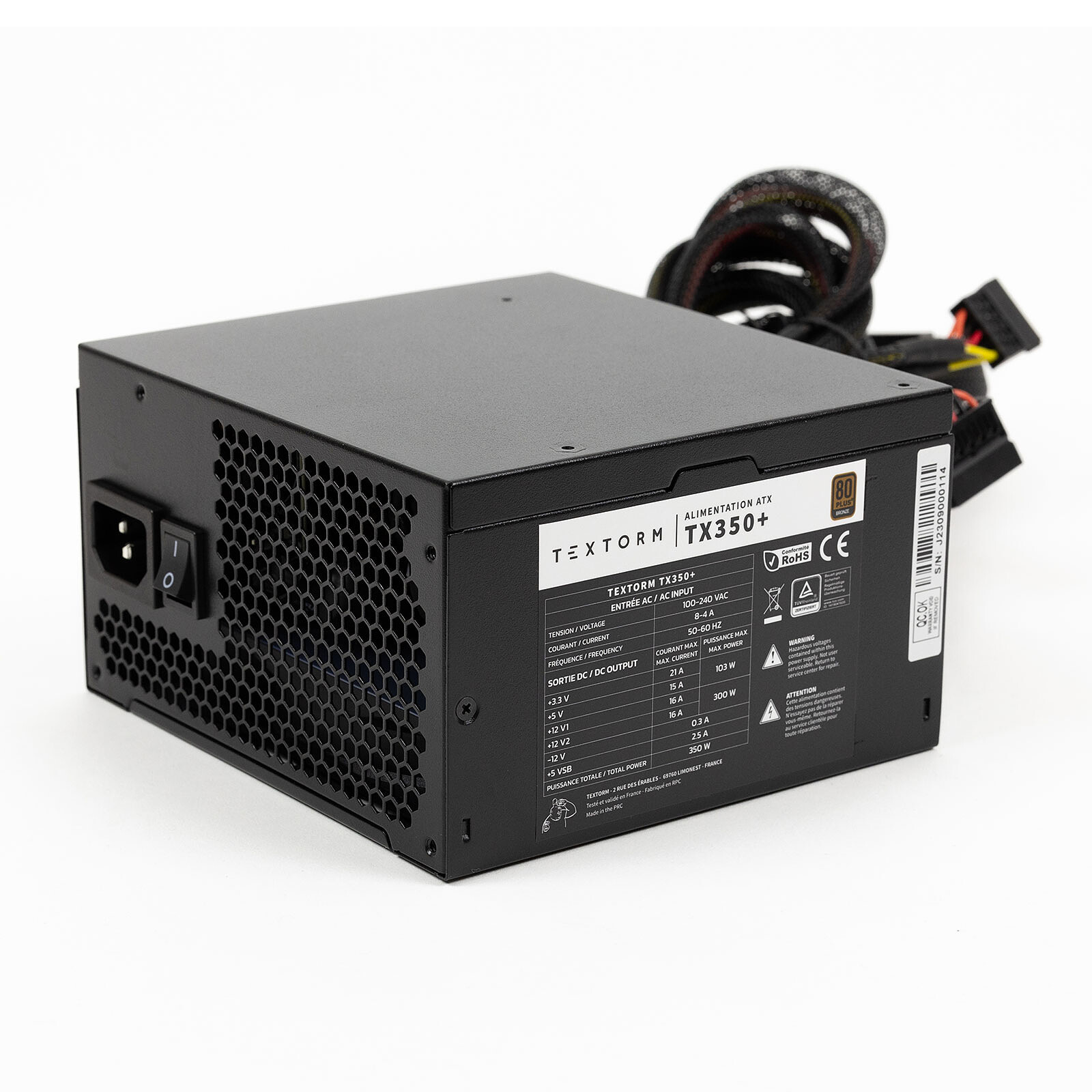 État Neuf Référence Constructeur TX350+ Ean 3601600004749 éco-taxe DEEE (incluse dans le prix TTC) 0,00 € Garantie en année(s) 1 Poids 1.4000 Marque TEXTORM Puissance (watts) 330 à 370 Norme 80 Plus Bronze Type de refroidissement Actif Modulaire non Eclairage RGB Non