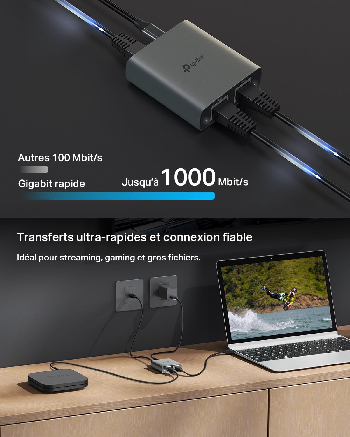 Le TP-Link Gigabit Ethernet Splitter EH210 offre une connexion réseau fluide grâce à sa capacité à gérer des débits jusqu’à 1 Gbps. Idéal pour optimiser la répartition de la bande passante, ce splitter permet de partager une connexion Ethernet gigabit entre deux appareils sans perte notable de vitesse.