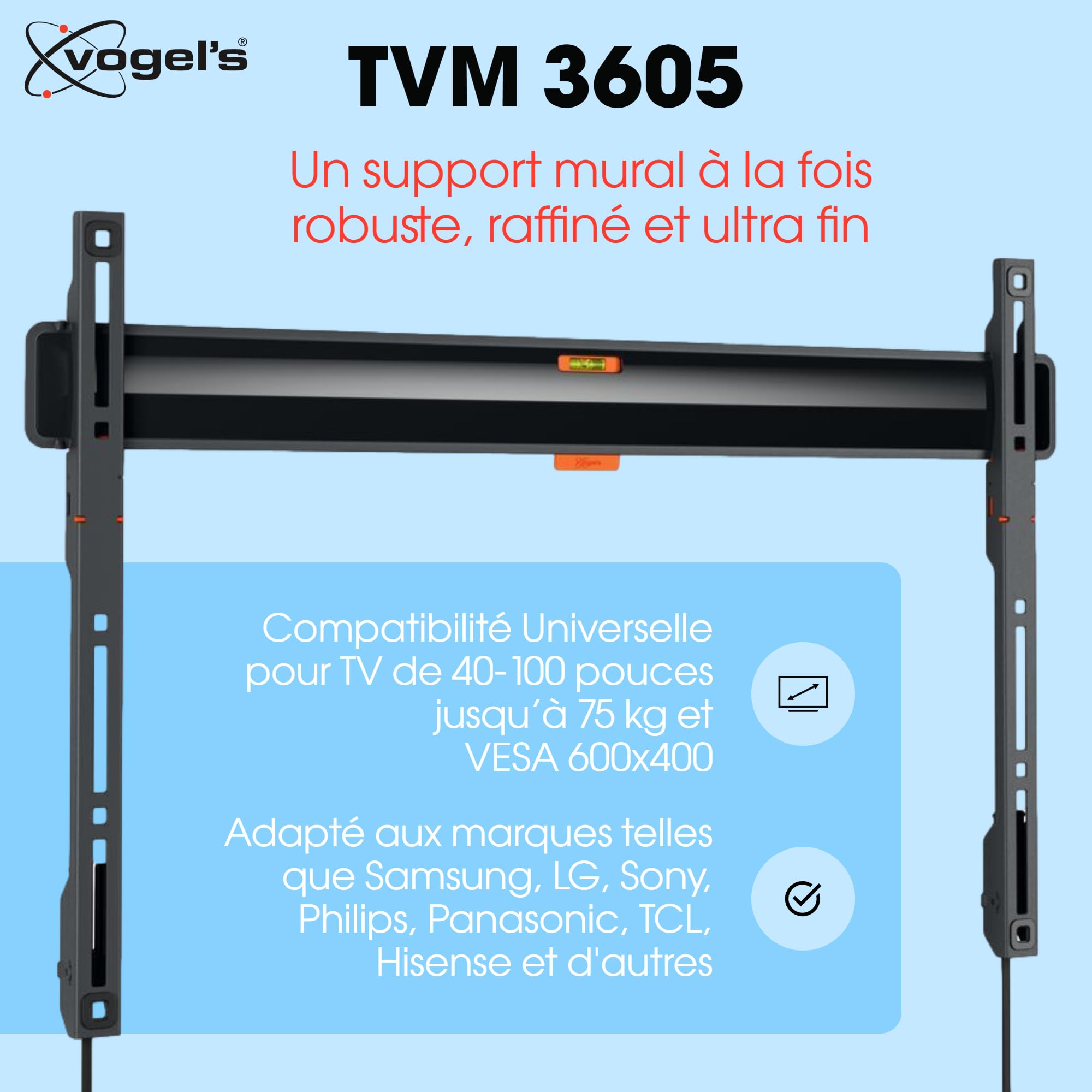 Le support mural VOGEL'S VOGEL S TVM 3605 combine solidité et design épuré. Sa structure en acier de haute qualité assure une résistance optimale capable de supporter des téléviseurs jusqu’à 40 kg. Son revêtement noir mat offre une parfaite discrétion tout en sublimant votre intérieur. Ce mélange de robustesse et d’esthétique fait du TVM 3605 un allié fiable et élégant pour fixer votre écran en toute sécurité.