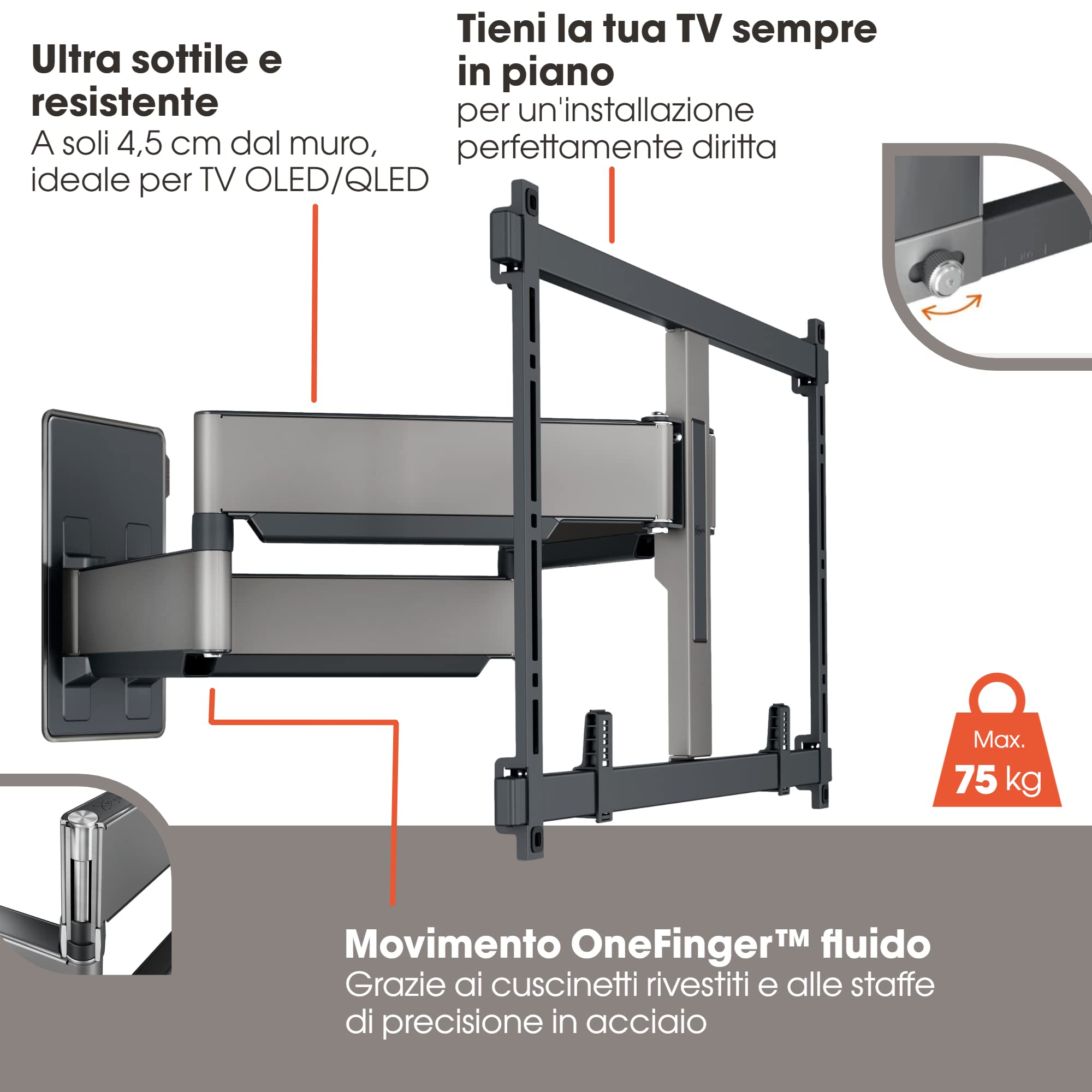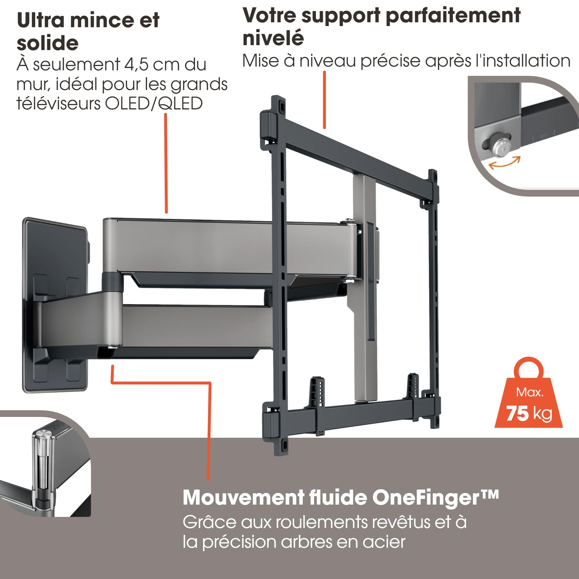 Grâce à un système ingénieux, ce support mural permet d’ajuster l’angle d’inclinaison jusqu’à ±15° ainsi que la rotation latérale jusqu’à +/- 60°. Ces réglages facilitent l’optimisation du confort visuel et la réduction des reflets, tout en s’adaptant aux différentes configurations de la pièce. L’opération reste simple et ne nécessite pas d’outils sophistiqués, offrant une expérience utilisateur fluide et rapide.
