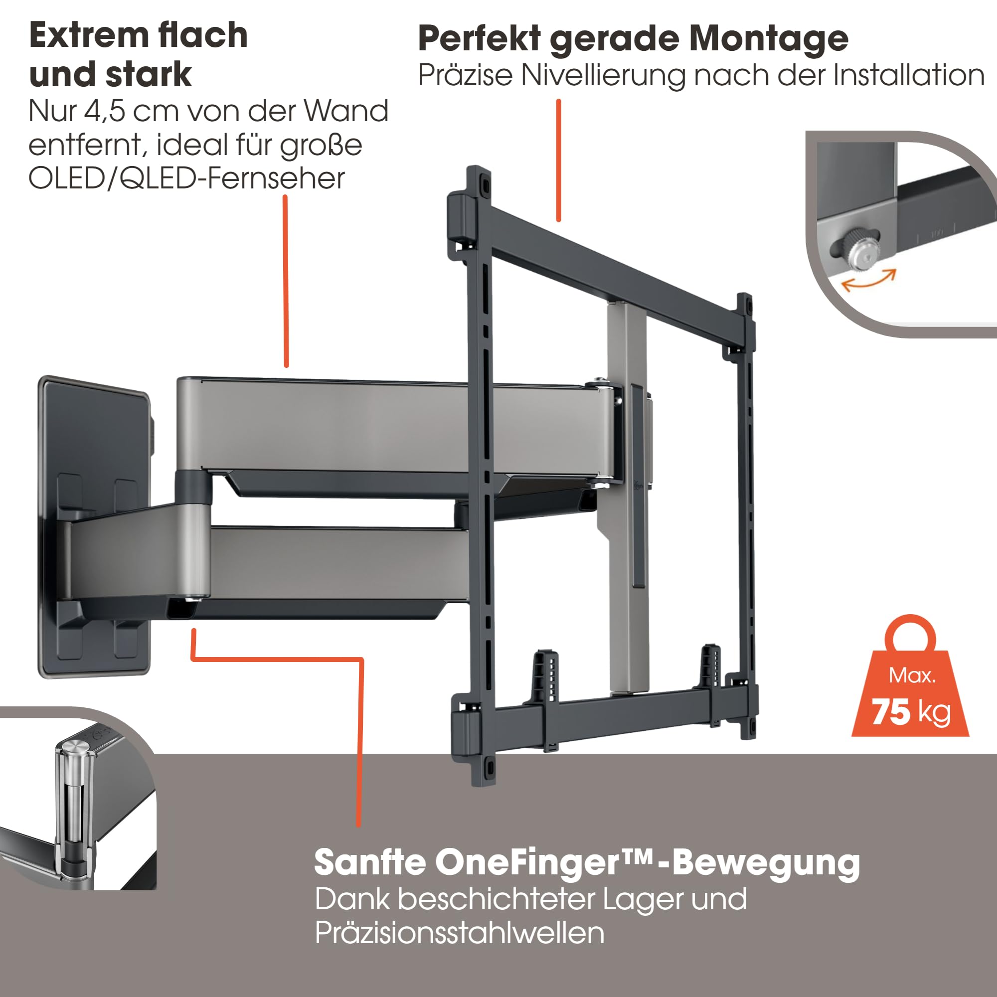 Le support affiche un profil ultra-fin, avec une distance minimale entre le mur et la télé d’environ 5,7 cm. Cette compacité maximise l’espace disponible et confère un look épuré. Le VOGEL S Support TVM 5855 allie ainsi fonctionnalité et esthétisme, contribuant à un agencement harmonieux de votre intérieur. Son épaisseur réduite diminue également l’impact visuel du support, mettant l’écran en avant sans compromis.