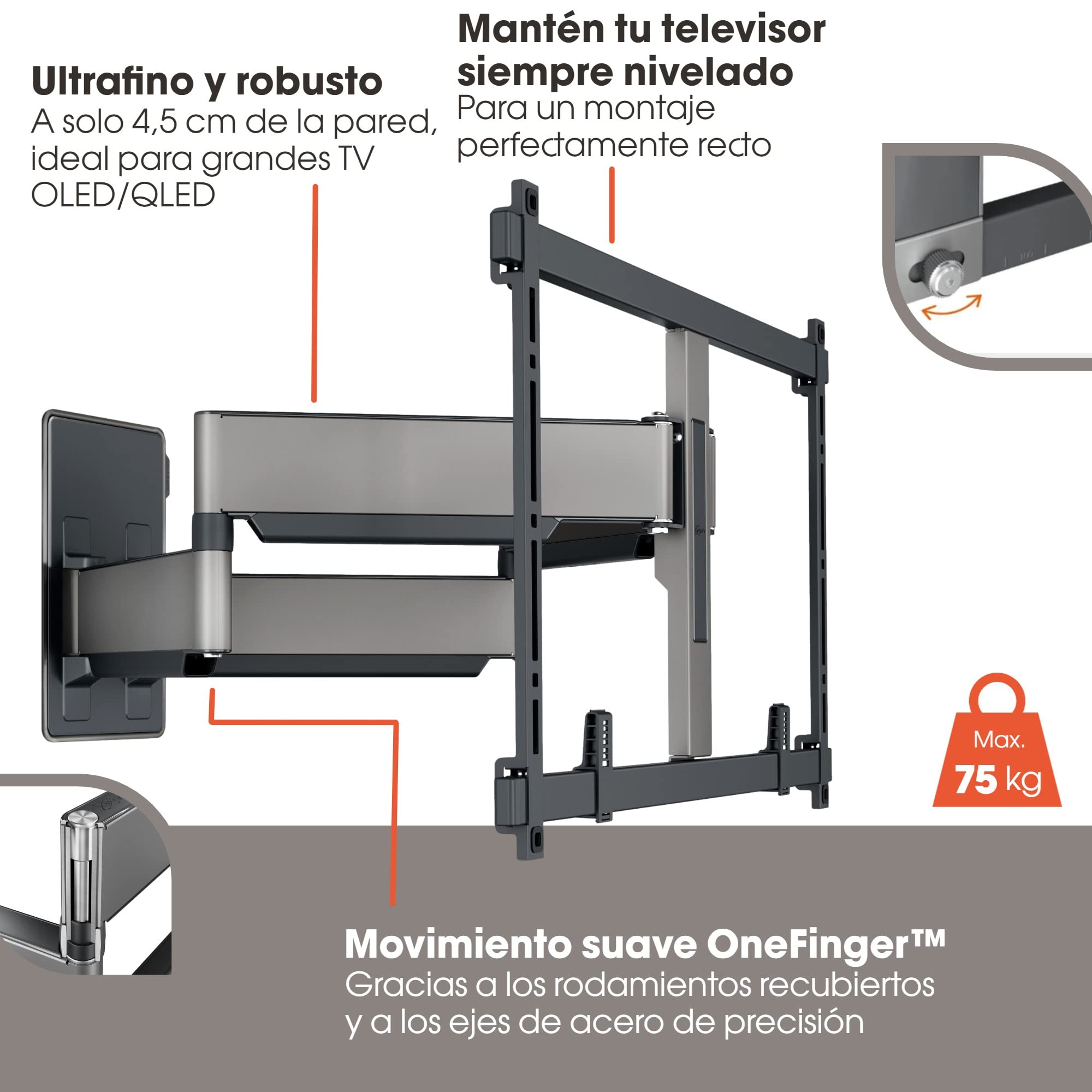 Le VOGEL S Support écran mural TVM 5855 s’appuie sur une structure en acier certifié, garantissant une résistance exceptionnelle pour supporter en toute sécurité des écrans jusqu’à 65 kg. Cette robustesse assure une durabilité renforcée et une stabilité à toute épreuve, évitant tout risque de basculement ou de flexion. Le design robuste s’allie à un fini noir mat élégant, s’intégrant parfaitement à tous les environnements, du salon moderne à une salle de conférence professionnelle.